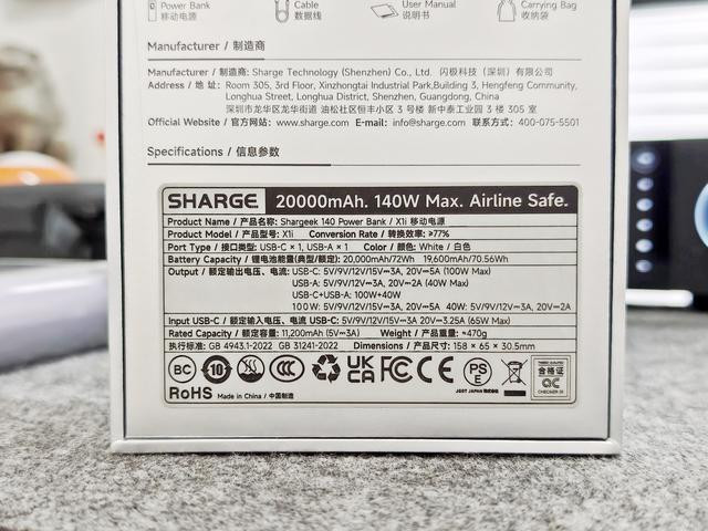 从包装盒上我们可以对这款移动电源的输入输出参数有一个更直观的了解,闪极银翼pro采用了四颗21700三星车规级电池,单颗容量5000mAh,四颗电池的能量为20000mAh/72Wh。USB-A接口可以输出5V/9V/12V 3A、20V 2A,Type-C接口可以输出5V/9V/12V/15V 3A、20V 5A,USB-A和Type-C同时输出时,最大可输出140W功率;而Type-C接口输入时,可输入5V/9V/12V/15V 3A、20V3.25A,所以最大充电功率为65W。