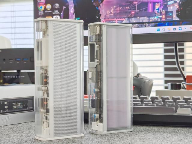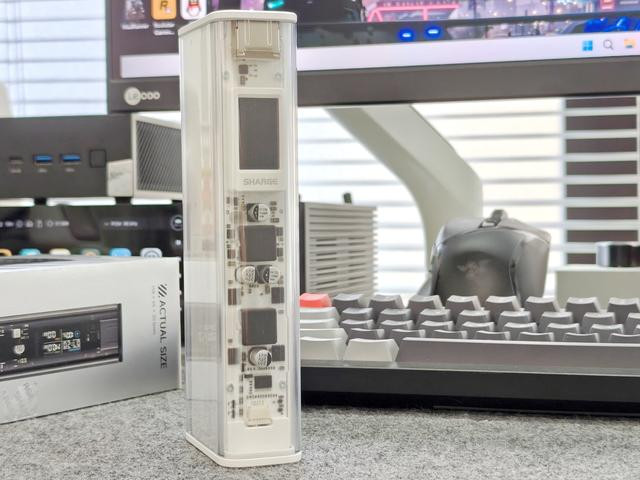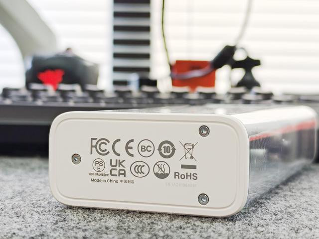 从正面看可以看到内部PCB板和元器件,而且PCB采用了白色设计,确实显得非常有科技感,这也是这几年不少产品都会采用这种透明设计的原因。当然了,如果从实用主义的角度来说,这种设计并不会给我们的使用带来什么不同,但是这种将产品内部结构直观的展现在我们面前所带给我们的富有科技美感的视觉体验,其实也是一种情绪价值。