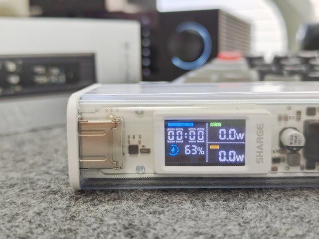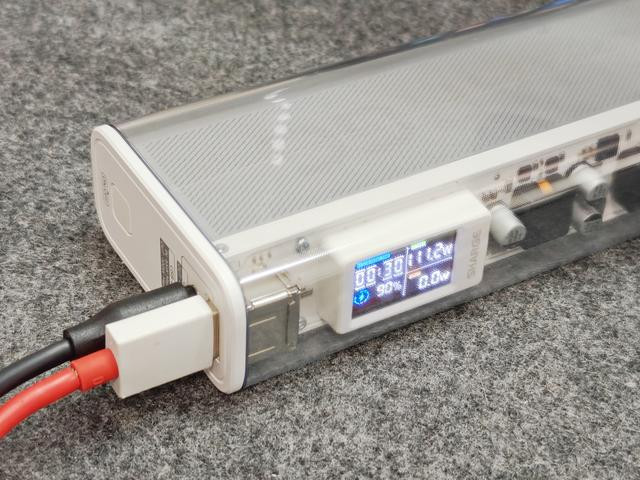 不过这块屏幕采用了内嵌式设计,有着更好的防水防尘效果,同时也更不容易损坏,我们能够从这块屏幕上我们可以非常直观的了解到充电速度、供电功率、剩余电量、充放电时间以及温度异常时的告警。唯一有点遗憾的是,因为外壳上设计有花纹,所以屏幕显示会受到花纹的干扰,如果能够将屏幕部分设计成无花纹的光滑面,显示效果应该会更好一些。